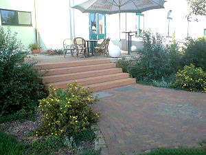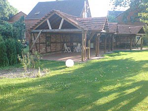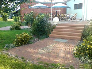 Planung und Gestaltung der Gartenanlage der Gastätte mit neuer Wegeführung, Bepflanzung und Grillwinkel aus alten Materialien.