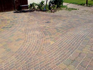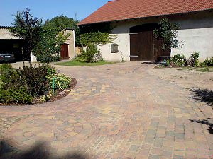Wegeführung aus Altstadtpflaster in verschiedenen Wegeformen musterverlegt.