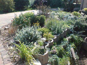 Ausgepflaster mit Naturstein (Feldsteinpflaster), mit immergrünen und blühenden Sträuchern und Stauden bepflanzt.
