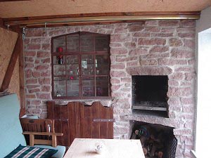 Grillecke aus rotem Sandstein inkl. Getränkefach und beleuchtetem Barfach.